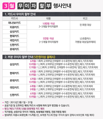 이전글 ▼ | 2015년 2월 무이자 할부 행사안내 | 관리자 | 2015-02-23 | 8884 |